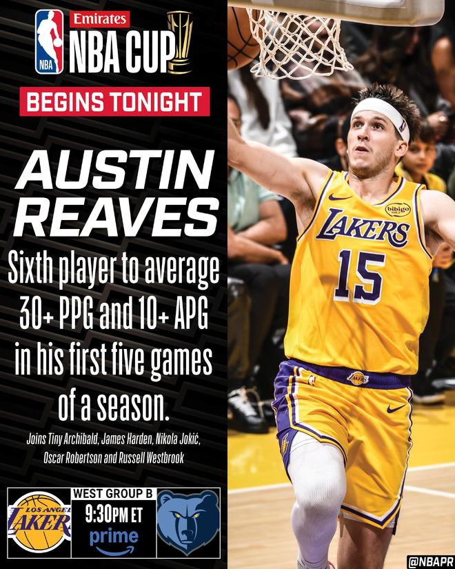里夫斯开赛前5场场均得分30+助攻10+,历史第六位达此成就球员