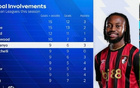 本赛季欧洲联赛参与进球榜:凯恩&姆巴佩并列第一