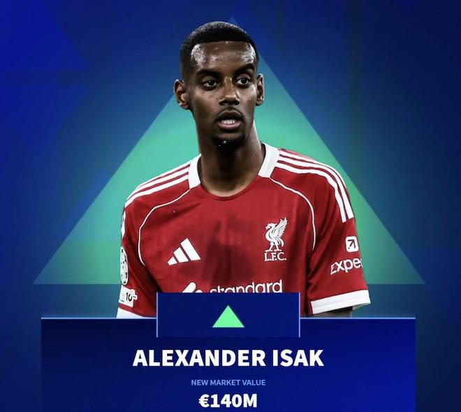 10月17日,德国转会市场网站更新了英超球员身价,利物浦前锋伊萨克身价上涨2000万欧,涨至1.4亿欧,对此,德转作出解释。