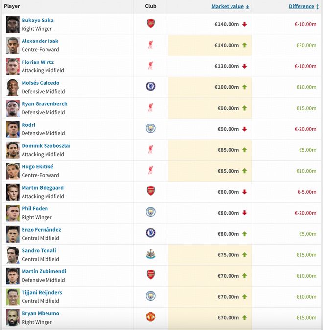 英超身价变更:维尔茨降至1.3亿欧,萨卡降至1.4亿欧,凯塞多升至1亿欧
